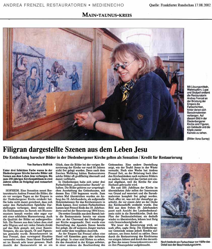 HOFHEIM. Eine Sensation nennt Restaurateurin Andrea Frenzel die Bilder, die sie vor wenigen Tagen an der Empore in der Diedenbergener Kirche entdeckt hat. Sie habe nicht damit gerechnet, dass sich unter den Farbschichten figürliche Darstellungen verbergen, denn meist seien die Holzkassetten im Barock mit Blumenmustern bemalt worden oder sogar nur mit einer schlichten Marmorierung. Auch die Qualität der Bilder sei außergewöhnlich. Die Szenen aus dem Leben Jesu sind sehr filigran und mit vielen Details direkt auf das Holz gemalt, mit einer Kasein-Tempera, die aus Quark, 01 und Pigmenten gemischt wurde. Bemerkenswert ist laut Frenzel, dass vorwiegend Blautöne verwendet wurden. Denn blauer Farbstoff sei im Barock sehr teuer gewesen. Nach Ansicht der Restauratorin ist es ein Glück, dass die Bilder bei der vorigen Renovierung der Kirche vor rund 50 Jahren nicht frei gelegt wurden. Denn nach dem Zweiten Weltkrieg hätten Restauratoren solche Bilder oft großflächig übermalt und damit verfälscht.